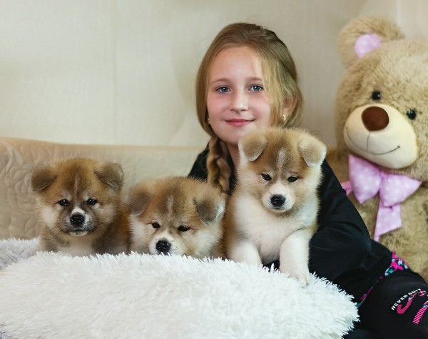 Очень важно, чтобы с раннего возраста щенки учились общению с детьми. Это способствует развитию устойчивой и здоровой психики и формированию правильных поведенческих реакций у взрослой собаки. Но такое общение никогда не бывает односторонним. Это всегда бесценный опыт и для детей, которые учатся доброте, дисциплине, заботе о ближнем, любви. У них формируется ответственность и чувство сопричастности к удивительному миру животных. В нашем питомнике все щенки с раннего возраста обласканы ручками наших деток, которые активно участвуют во всех сферах жизни питомника. Акиты прекрасно ладят с детьми, защищают их и никогда не дают в обиду.